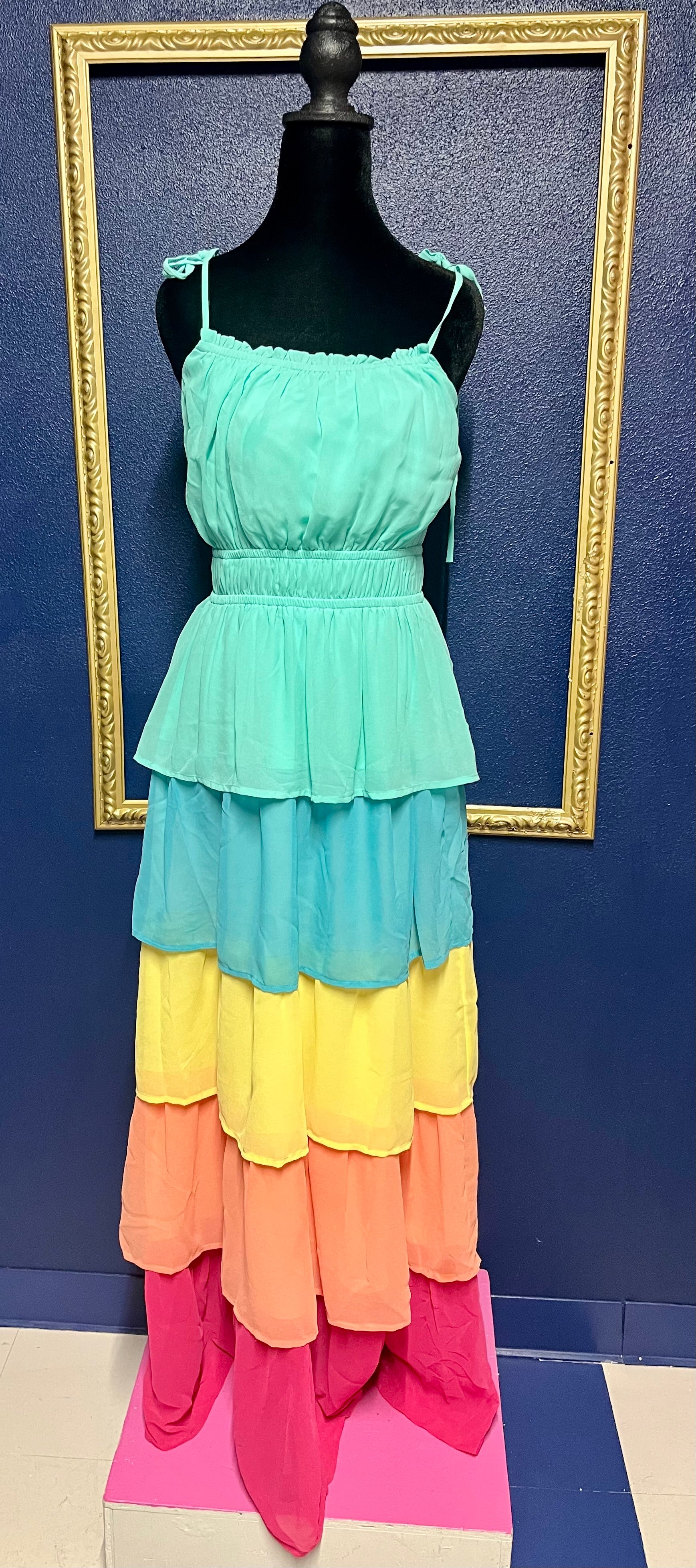 The Aura Rainbow Tiered Maxi Dress showcases expertly designed tiered ruffles that add texture and movement, complemented by bold color block panels for a vibrant, contemporary feel. This dress combines playful details with a feminine silhouette, ideal for those seeking a stylish piece that stands out with effortless charm.