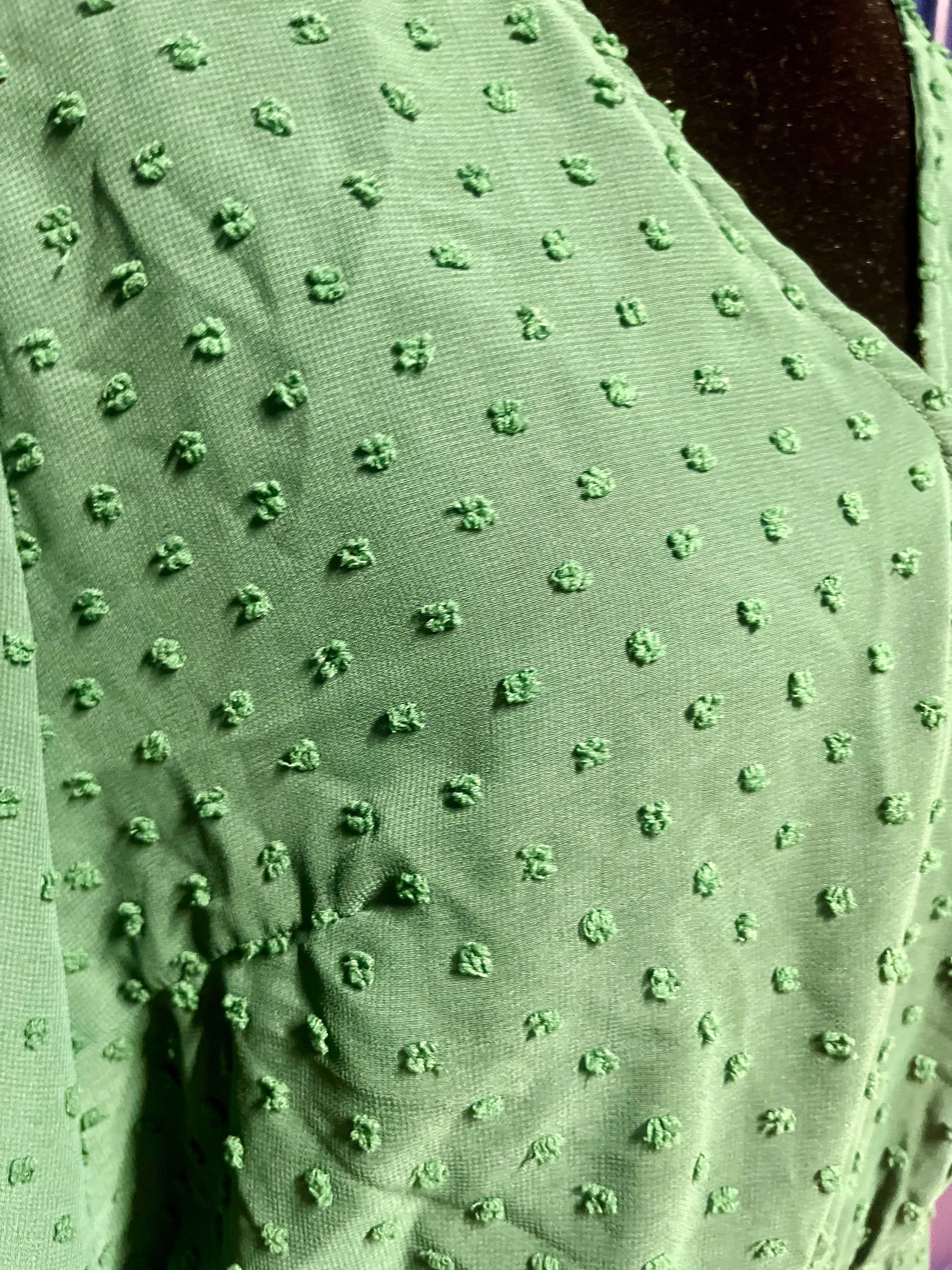 This elegant emerald green dress features a sophisticated raised dot pattern that adds visual texture and dimension to the fabric. The sheer sleeves provide a refined, airy quality while maintaining an understated elegance. The combination of rich jewel-tone coloring with the dimensional dot detailing creates a versatile piece suitable for both professional settings and special occasions. The sheer sleeve construction offers a modern silhouette that balances structure with delicate femininity, making this dress a polished addition to any wardrobe.