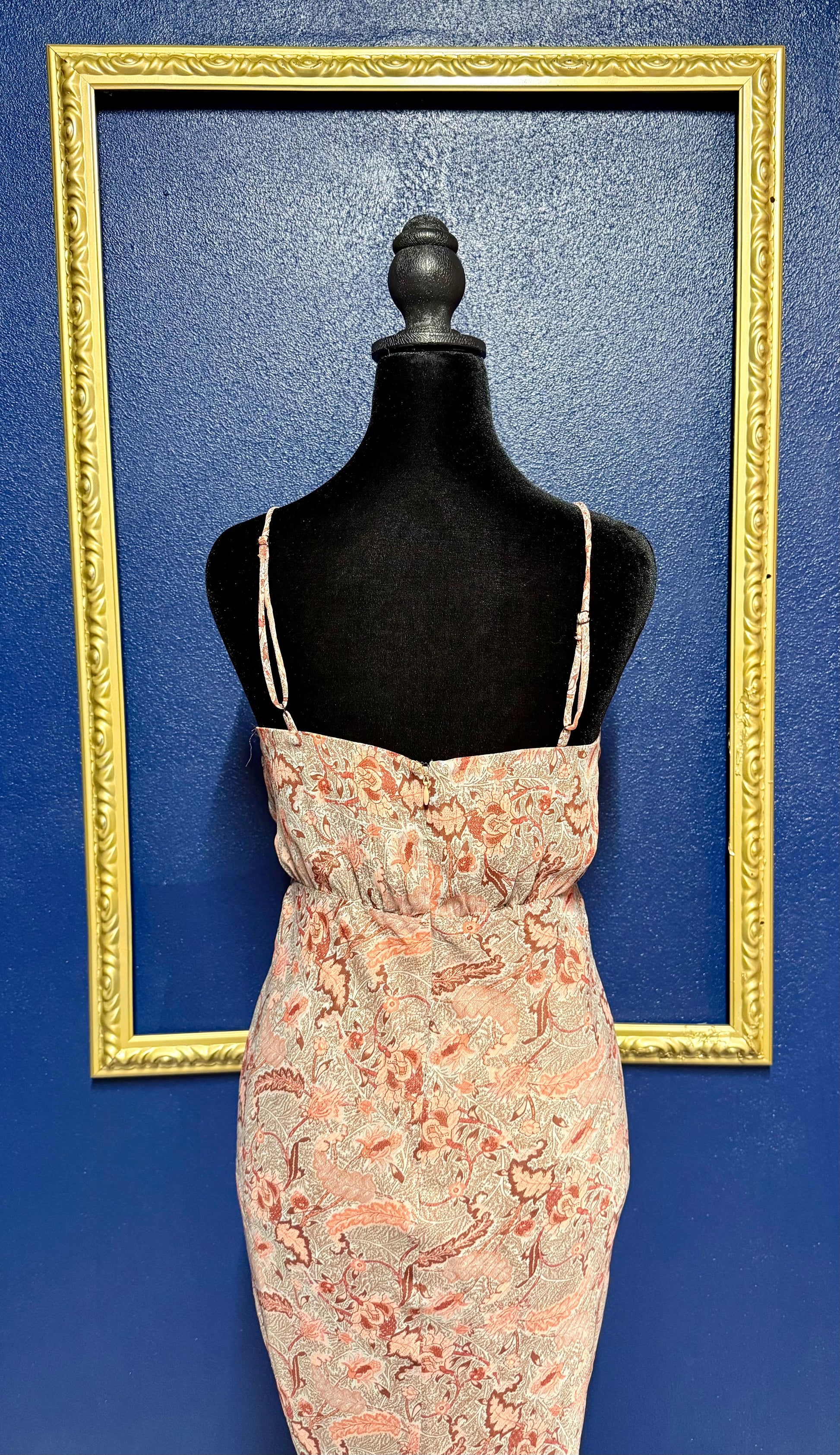 This elegant Floret Studios Rouched Ruffle Dress features metallic details woven into the fabric for a subtle shimmer that catches the light beautifully. Expertly designed with flattering ruching, it enhances natural curves while providing a comfortable fit. Adjustable straps allow for a customized silhouette, making this dress both stylish and versatile for various occasions.