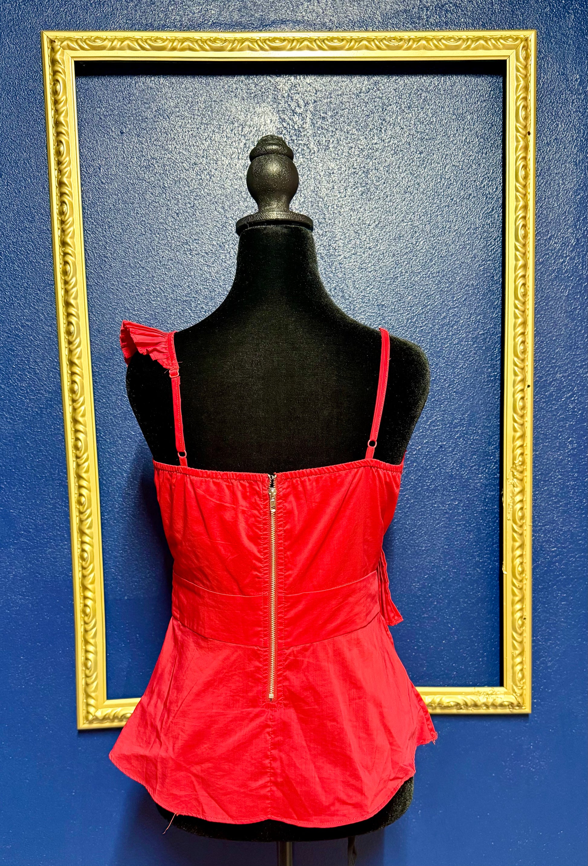 The J. Roberts Pleated Ruffle Top features adjustable straps for a customized, comfortable fit and a durable metal zipper that ensures secure closure and easy wear. Its elegant pleated design with delicate ruffle accents adds a refined touch, making it a versatile piece for both casual and dressier occasions.