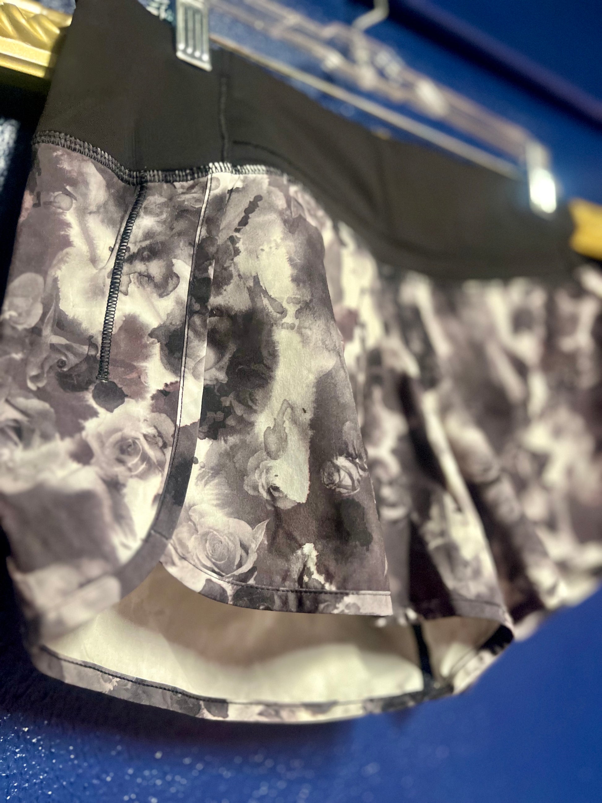 These Lululemon shorts combine black and gray tones with a subtle floral print, offering a sophisticated yet sporty look. Designed for comfort and mobility, they provide an ideal fit for active lifestyles while adding a stylish touch to your workout wardrobe. Perfect for training sessions or casual wear, they blend performance with understated elegance.