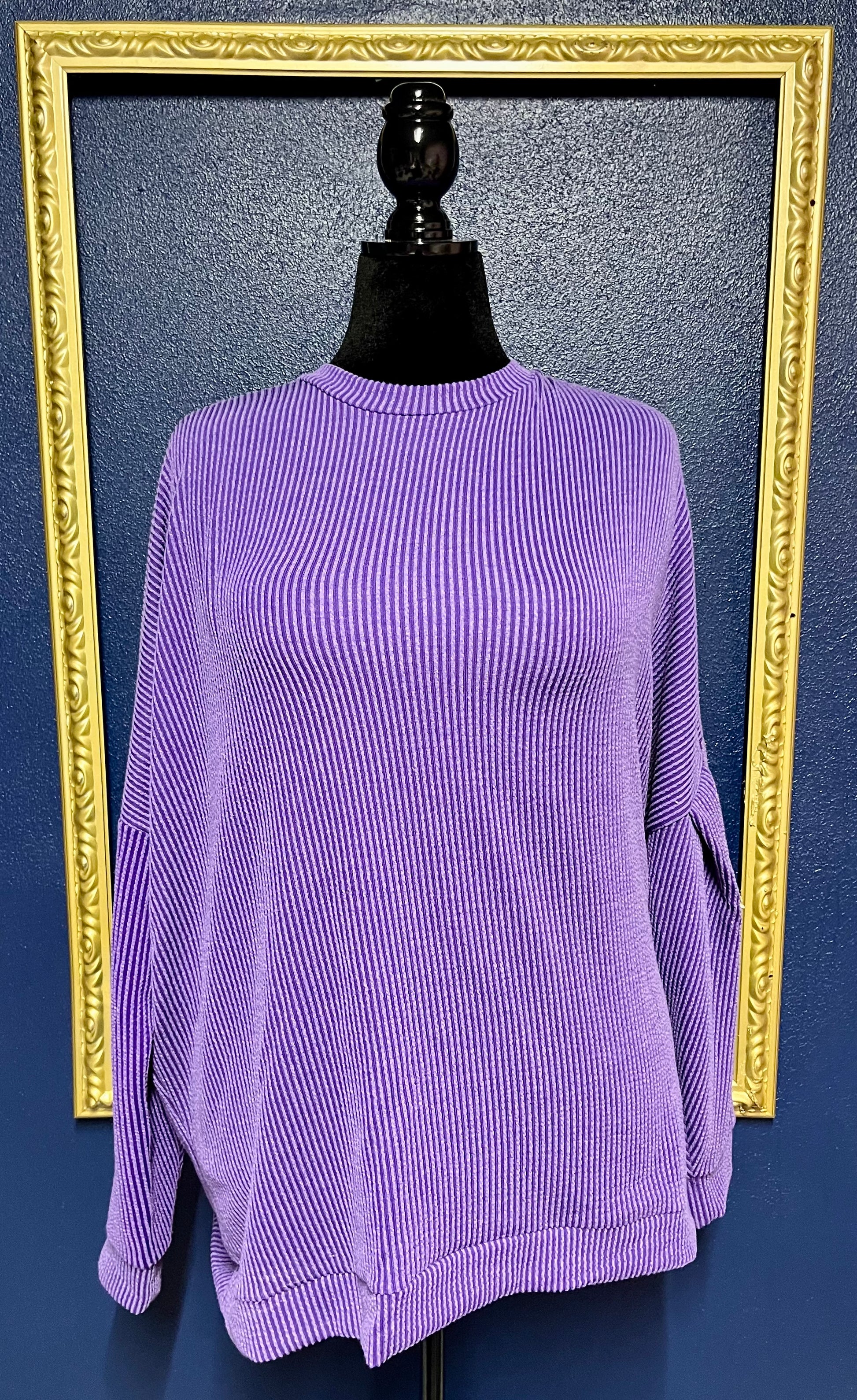 Crafted for superior softness and comfort, this Purple Ribbed Pullover showcases a finely ribbed texture that offers subtle stretch and an oversized fit. Its lightweight material promotes breathability, making it ideal for wearing alone or layering, providing warmth and comfort while maintaining a polished look.