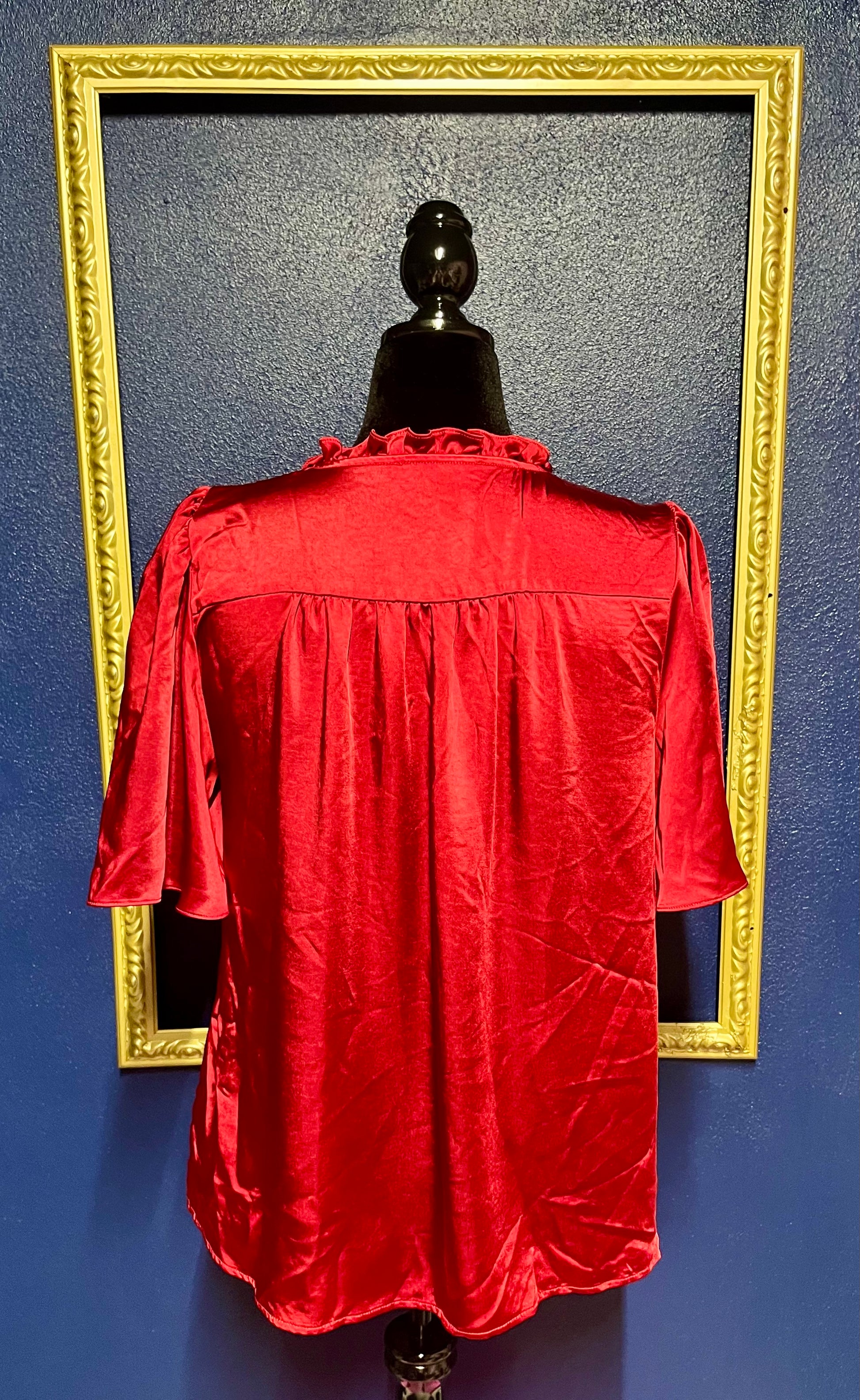 Elevate your wardrobe with this striking Sugarlips red silk blouse, designed to make an immediate impression. The luxurious silk fabric drapes beautifully while maintaining its shape, offering both comfort and sophistication. The defining ruffle neckline adds romantic dimension and visual interest, while the adjustable tie closure at the neck allows you to customize the fit and silhouette to suit your preference. Perfect for transitioning from professional settings to evening occasions, this versatile piece pairs effortlessly with tailored trousers, skirts, or layered under structured jackets for added dimension.