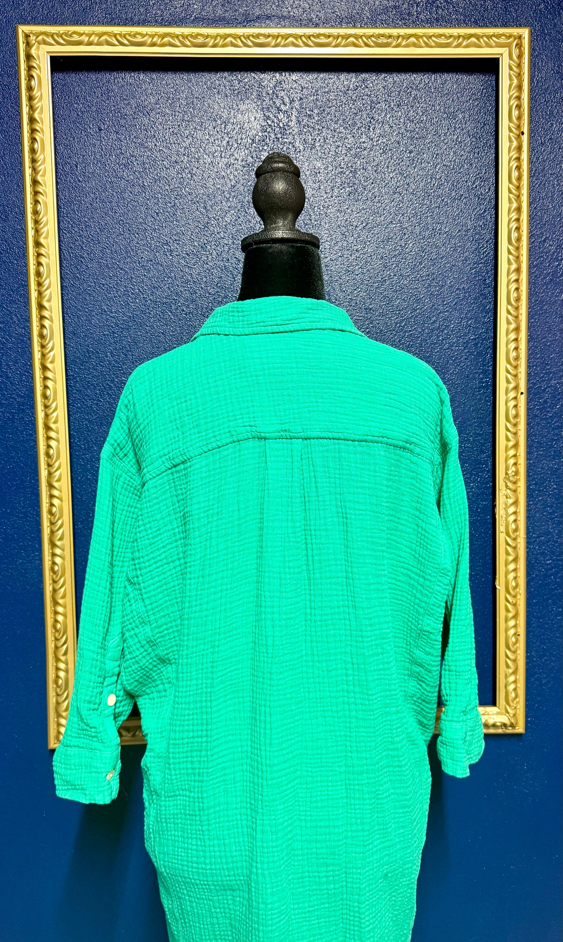 This Universal Green Button Up Dress is crafted from lightweight gauzey cotton fabric in a vibrant Kelly green shade. The breathable material ensures comfort throughout the day, while the classic button-up design offers versatile styling options suitable for various occasions. Its soft texture and relaxed fit make it an excellent choice for effortless, polished wear.